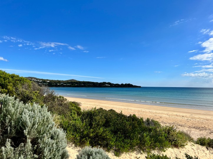 We were very surprised to see how calm the open waters were. When we looked to the left from this spot, we were looking towards the settlement and surfing area of Greens Beach, where quite a few cars were parked.