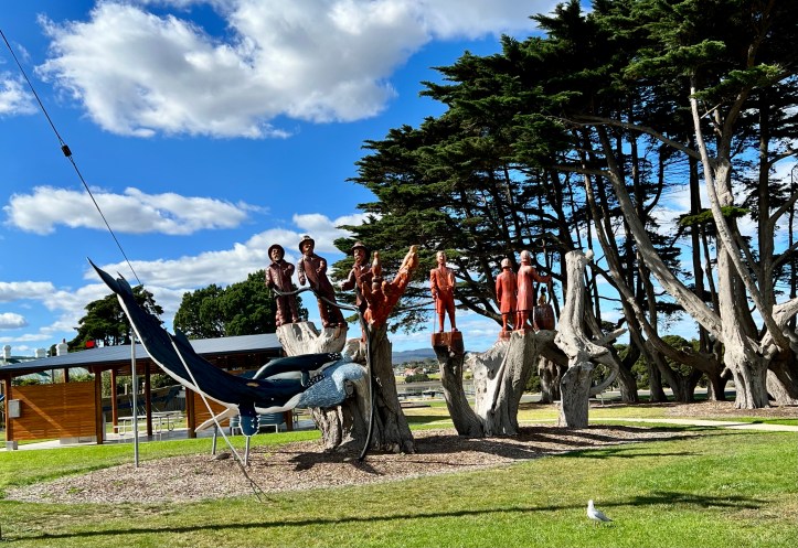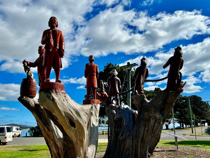 These chain-saw carvings were commissioned almost 10 years ago to make use of old macrocarpa trees, that were past their use-by-date. Macrocapa trees are not indigenous to Tasmania, they come from California, and were widely used as wind breaks. Looking at the size of them you can see why.