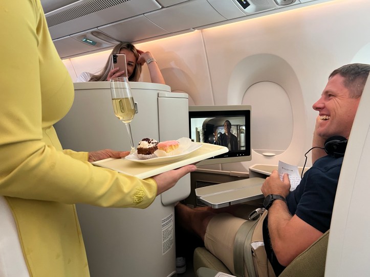 The Business Class flight crew soon realised it was our son’s birthday and made a special presentation to him which included a glass of French Champagne and french petit fours while they sang “Happy Birthday to You”!