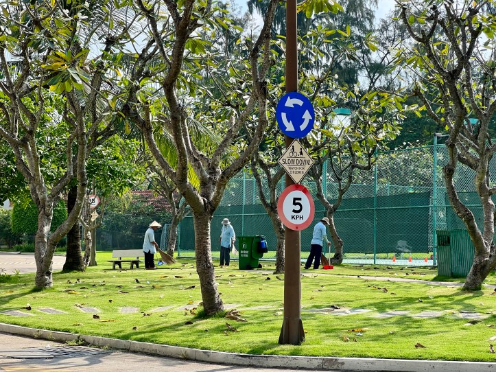 Our apartment is spotless and these people were tidying up the leaves that had fallen over night in our apartment complex.