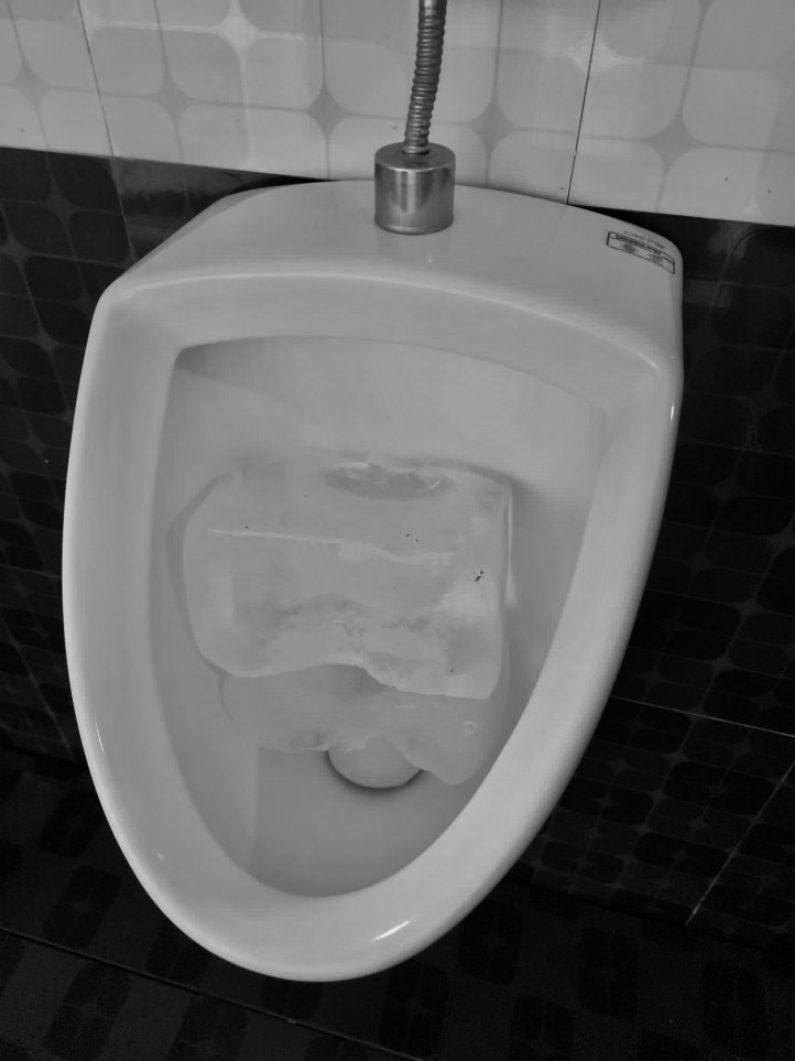There was a huge block of ice in each urinal – we assumed for flushing the toilet slowly as the ice melted.