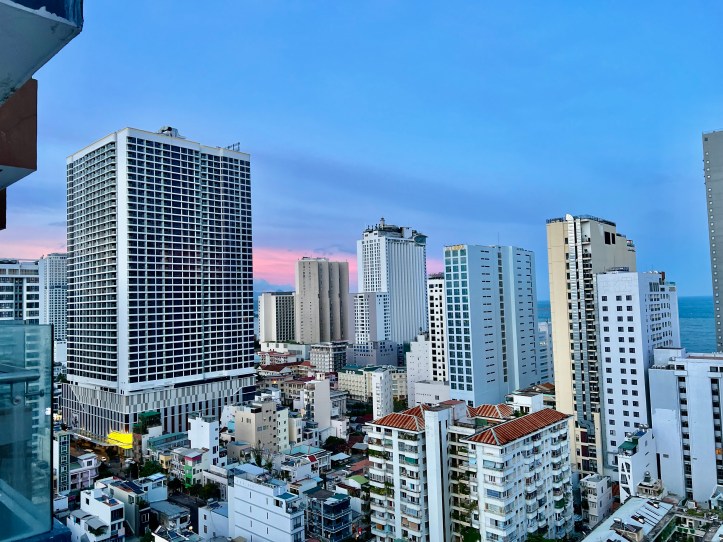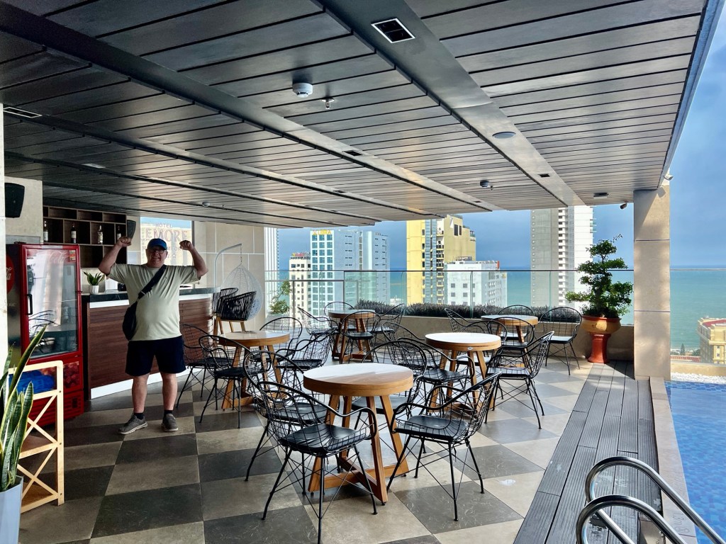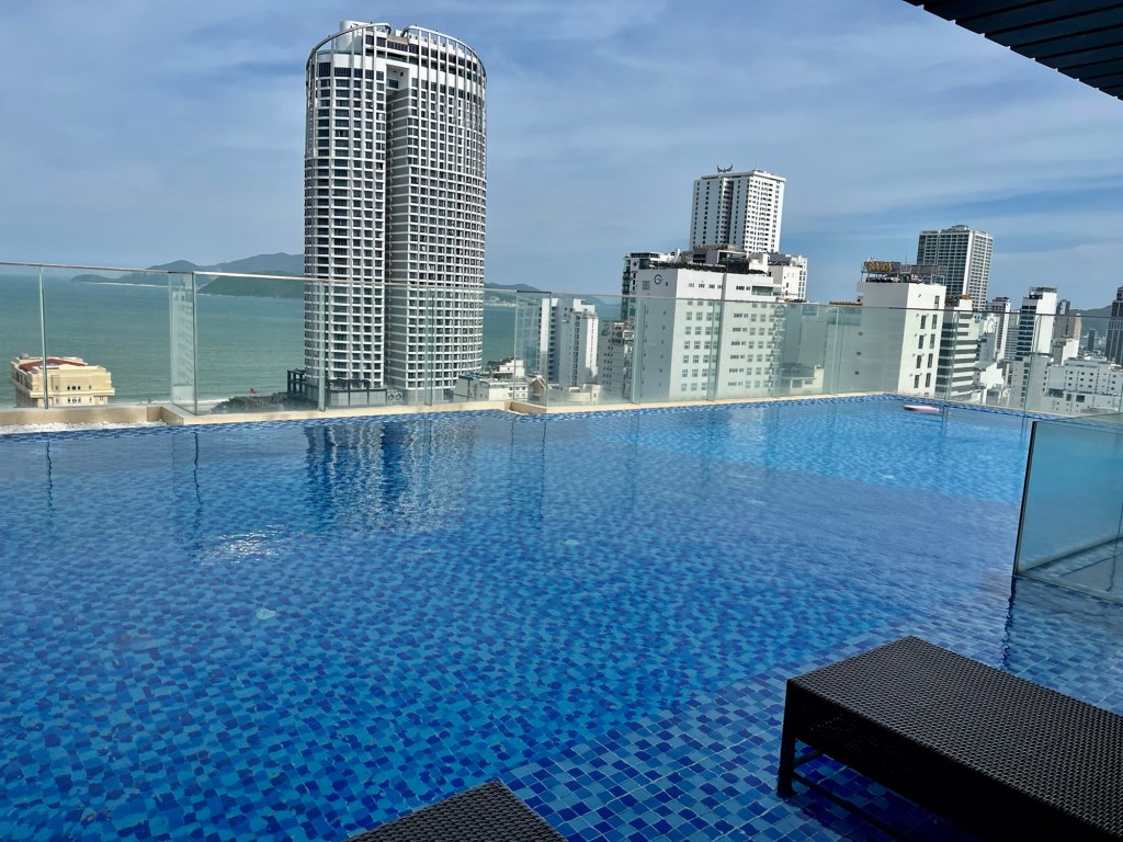 Mick and I will spend 5 nights here so we decided to explore the facilities. We found the rooftop gym, pool and bar area on the 21st (and top) floor, where we later had a swim with quite a few small children. As I ventured in slowly, one of the little girls decided it would be fun to splash me – so I had to take the plunge more quickly than I had wanted to. The view from the pool was pretty nice.