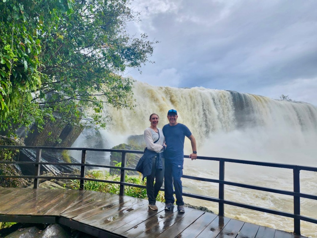 They stopped at an impressive waterfall, enjoying the opportunity to stretch their legs.