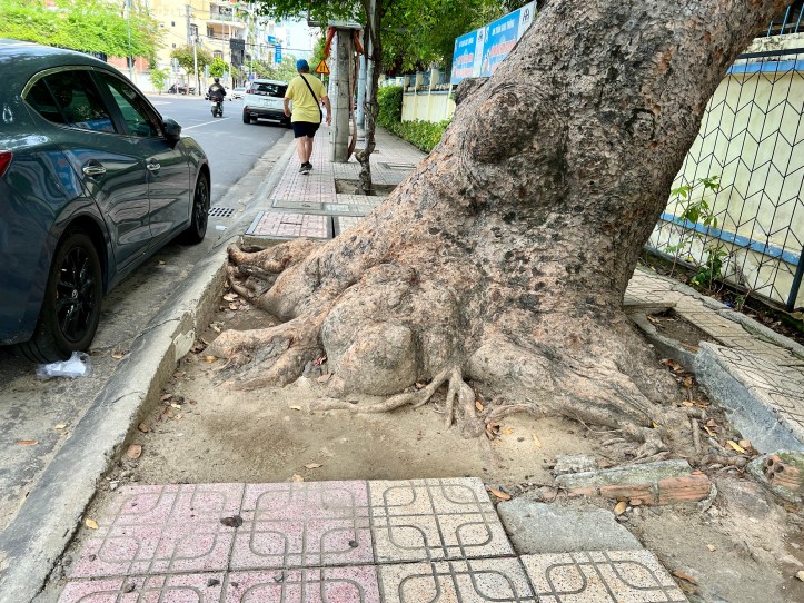 Definitely worth a close up shot of the base of this tree taking up the full width of the footpath. And very typically, a car parked next to it, making it harder to walk on the sloping gutter.