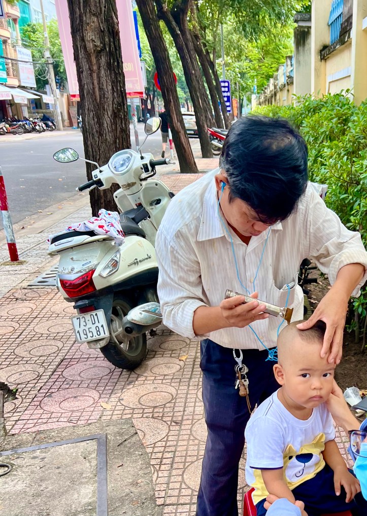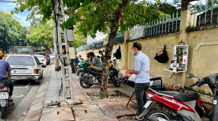 What turns a 1.9km walk into a challenge in Nha Trang, and Vietnam in general, are the hazards encountered every few steps. Footpaths here are used for parking bikes and cars, setting up street stalls or cafes, and for enjoying a meal. But this was a first for us. We spotted a row of barbers set up on our walk to Dam Market.