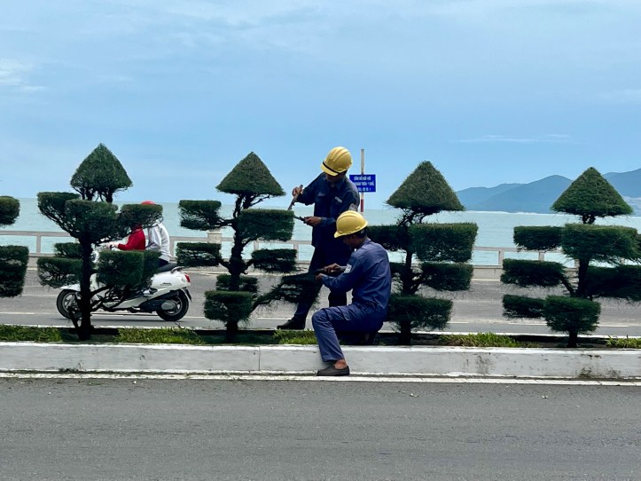 The main road in front of the beach, Trần Phú, was getting some maintenance as we walked past. There was a team of men using hand held clippers manicuring these topiary trees.