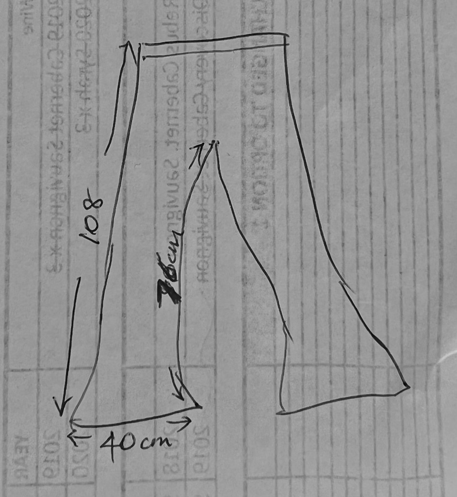 This is the sketch I made for the ‘outfit’ pants I wanted to have made; drawn quickly on a piece of scrap paper just before we left home.