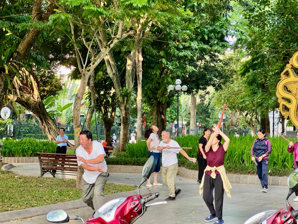 I started to walk in a clockwise direction in search of information about water puppet shows – famous here in Hanoi. I had spotted a theatre a few days ago near the lake. I was the only person walking in that direction and I was being passed by dozens of people on their morning walk; a little perturbed I was not following an unwritten rule for lake walking. After finding the theatre, I rejoined the crowds and walked in the correct (counterclockwise) direction. I assumed it has something to do with driving on the right hand side of the road (opposite to us in Australia), but found it was more complicated (or simple) than this. Even the Olympic Committee has had a say about the direction for walking, as far back as 1913.