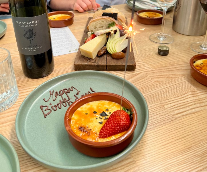 The duck liver parfait on toast was a favourite with us all, and the seafood course with rock lobster and scallops was amazing. We purchased a bottle of Museum Release 2011 Riesling to go with these, and a bottle of 2020 Cabernet Franc to accompany the pork belly and lamb courses.
