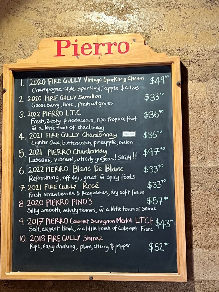 We were seated outside overlooking the garden and dam, and sipped and sampled wines in the finest glassware I think I’ve used. The first wine we tasted was their champagne style bubbles – 2020 Petit Lot Mousseux, made from Chenin Blanc. Mick loved it so we bought a bottle to share with our platter we had for dinner.