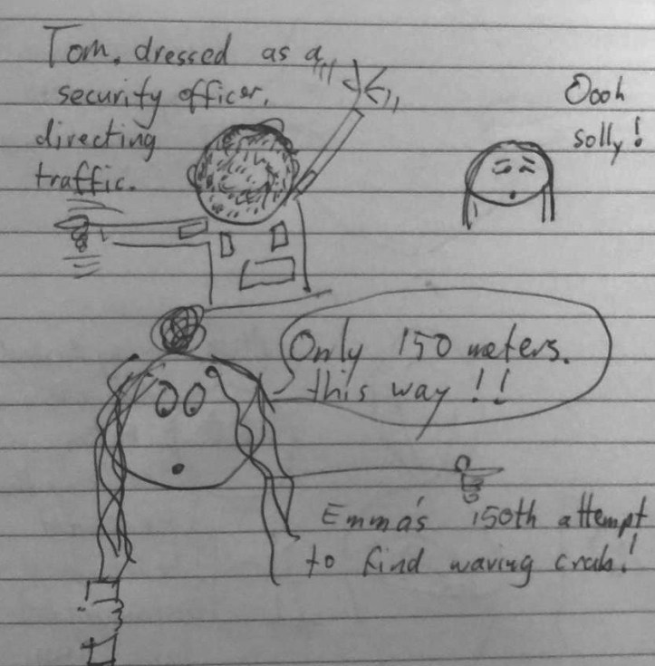 I did mention before that Mick often sketches some of the funnier things that happen when we are travelling, drawing them in our common diary where I write important things like what we spent on our credit card for the day, and what that cost converts to in $AUD. I also like to mention the weather and how far we have travelled that day if we have hired a car. Different priorities.