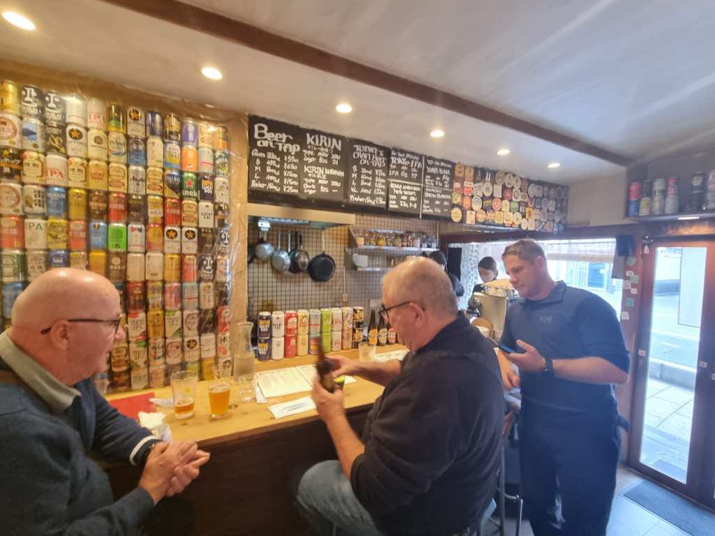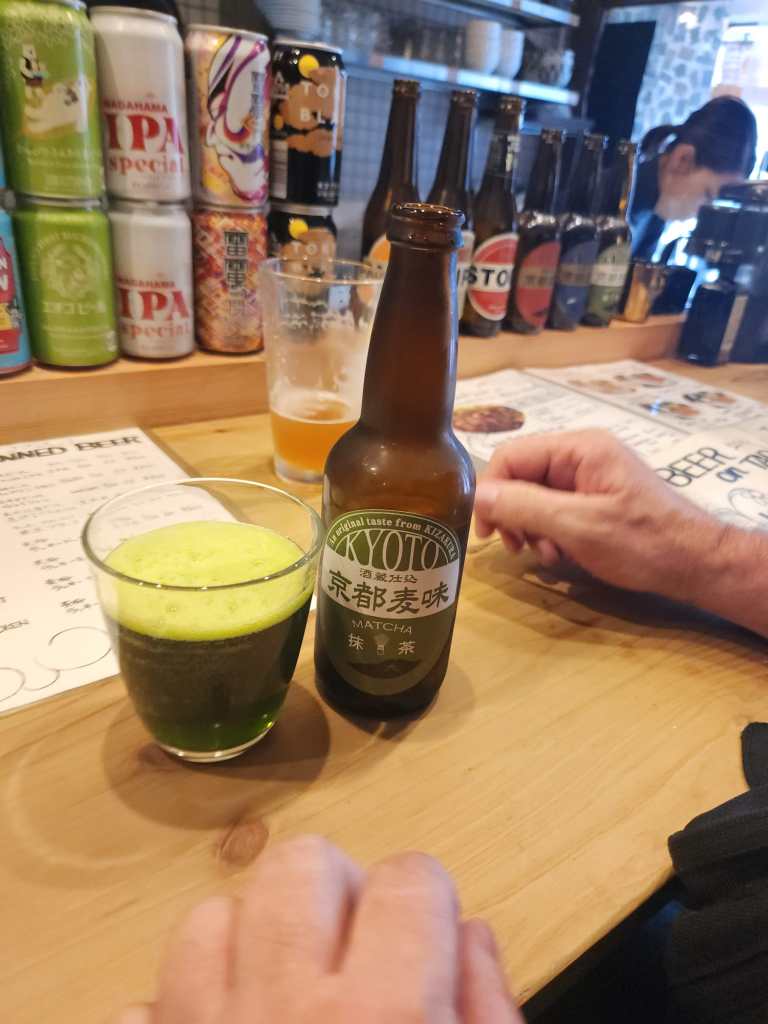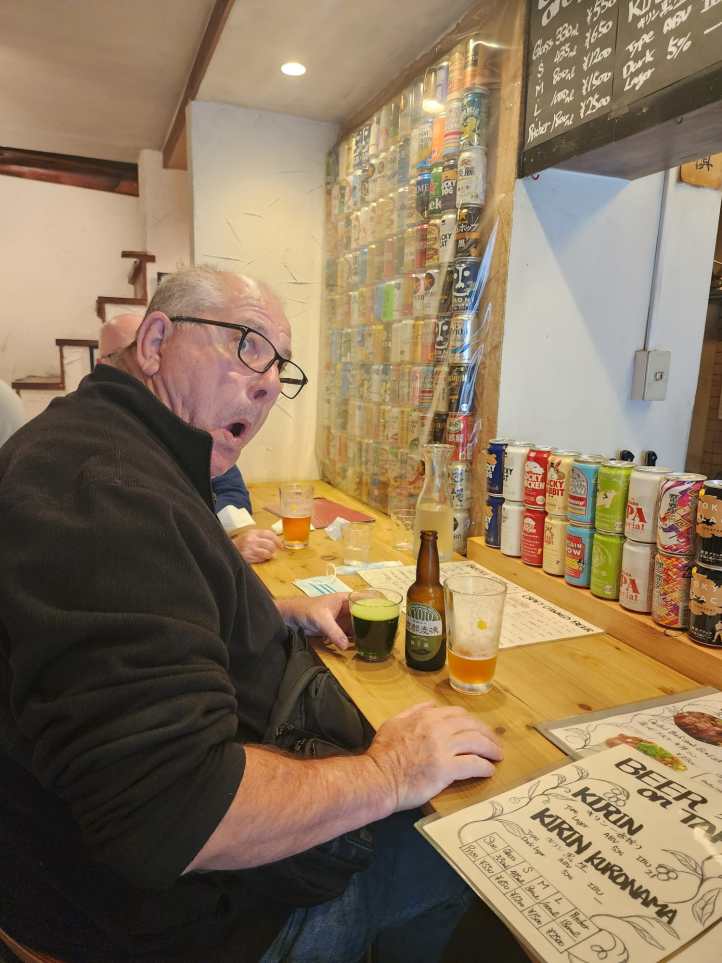Mick said he did 10,000 steps today after having done 15,000 the day before. He also mentioned his knees were about ready to pack it in (those are my words and not his). So I am guessing that when they came upon their next ‘stop’ he was just happy to sit down for awhile. But as another treat, this bar sold very interesting craft beer, where Mick tasted his first ever green tea IPA.