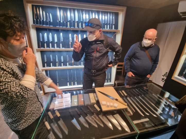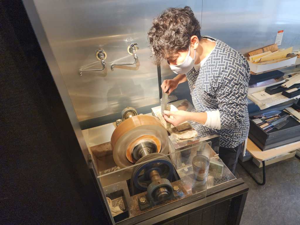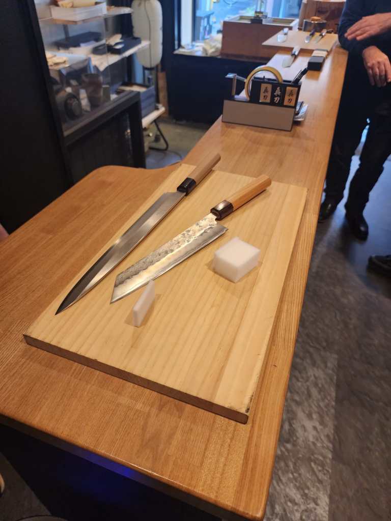 Tom selected two knives. Mick tried out one of his options, and then the finishing touches were added, which included having his name engraved on them in Japanese.