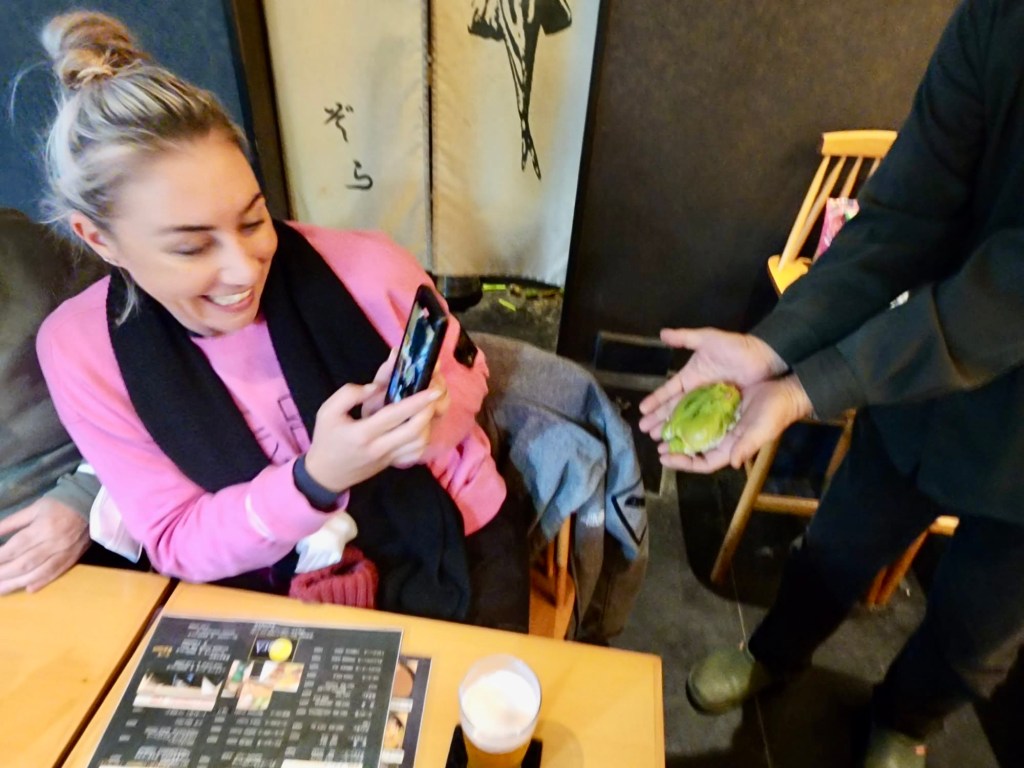 Emma has been shown a frog while she selects from a menu and I am unsure if this is like in a Chinese restaurant where you get to select your seafood from a live tank before it is cooked, and Bernie has decided to dress as a geisha.