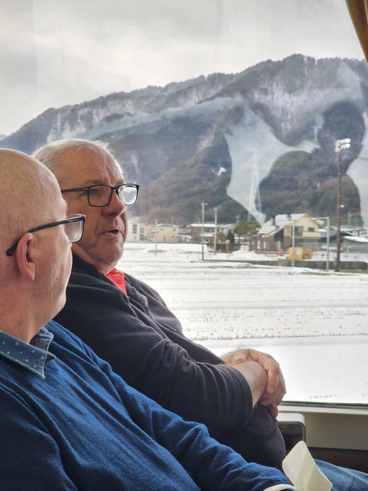This morning they headed for Takayama – which involved catching two trains – a bullet train (shinkanzen) and a traditional train. It was very windy and freezing when they arrived. The journey took them past Bernie’s old town – where he had spent a year teaching English. They had decided against stopping off there as there was not a lot to see.