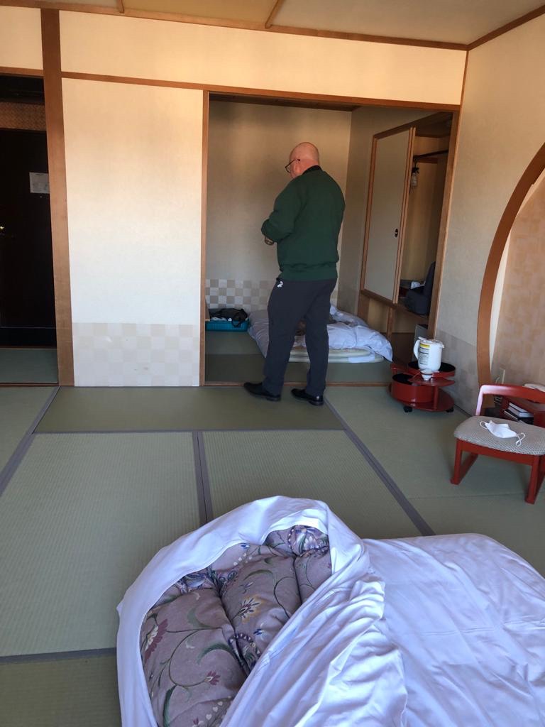 I heard from Mick pretty early today to report that his back was a bit sore from sleeping on the floor. Quickly followed by a comment saying he was still having fun. While the room’s furniture is challenging for sleeping, he says there is nowhere to sit and nowhere to put anything. In other words, a lot of bending is involved.