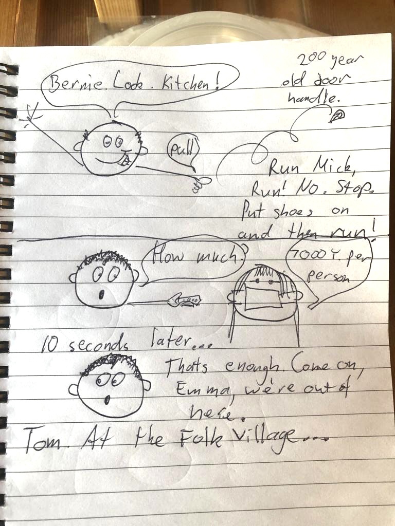 There was a ‘little accident’ that occurred during their visit which I’m told required a fast exit. Apparently Mick accidentally broke the handle of a door in one of the houses – the one belonging to the “wealthy” man. Due to the language barrier, none of the group knew how to explain this. So….