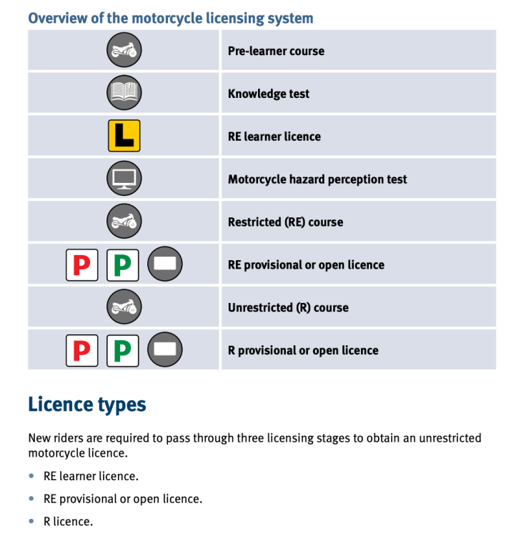 There are three licensing stages to obtain a motorcycle licence in Queensland. We achieved the first level by completing and passing the two-day Q-Ride Pre-Learner Course, which cost us each $550. It was a further $27 to do the online knowledge test of 30 questions, which was also required as part of the process. W now have an RE licence, which basically means we are able to ride learner approved motorcycles. We are now at the third step in this process, and that is going to do us.