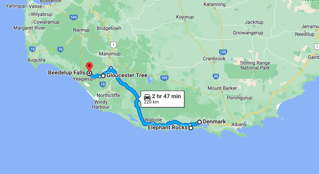 We are actually making our way back to wine country, and the township of Margaret River. Beedelup Falls was a nice distance to travel in one day. The weather was drizzling with rain for most of the morning, but thankfully Mick had put his hand up to do the driving today.