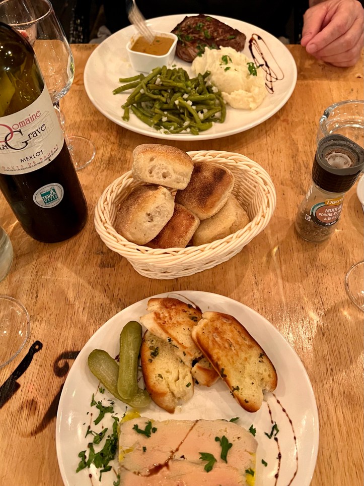 We ate out at a restaurant specialising in beef – Mick’s choice – and he had a fillet steak with garlic-ladened green beans, and I had the fois gras maison. We were both happy.
