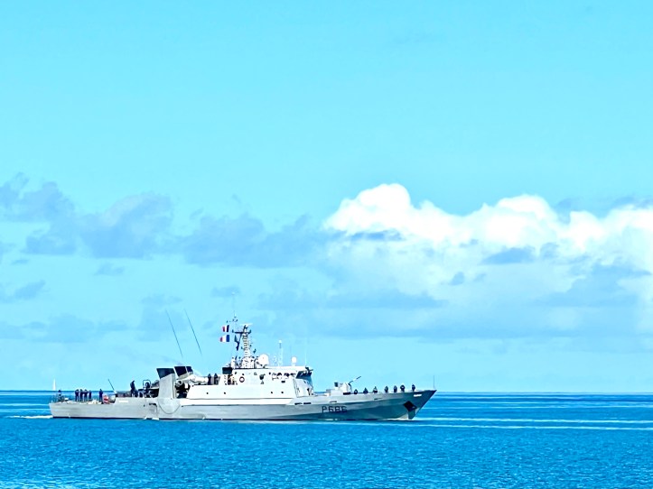 Mick and I had spotted a patrol vessel on the open waters in Anse Vata on Sunday – travelling very quickly, with the crew standing at attention on all the decks.