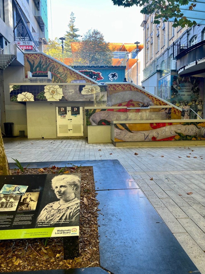 We passed a few more hours wandering the area near our accommodation. Mick found a plaza or square dedicated to women and the suffragette movement. The square celebrated the centenary of women gaining the right to vote in New Zealand – and was commemorated in September 1993.