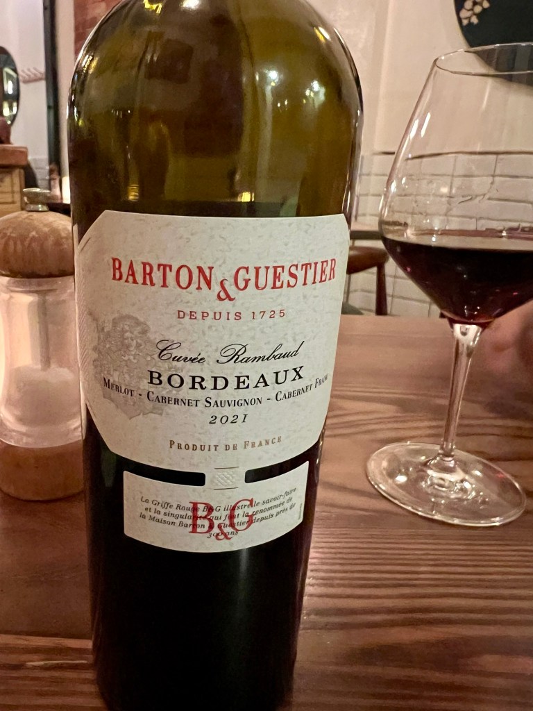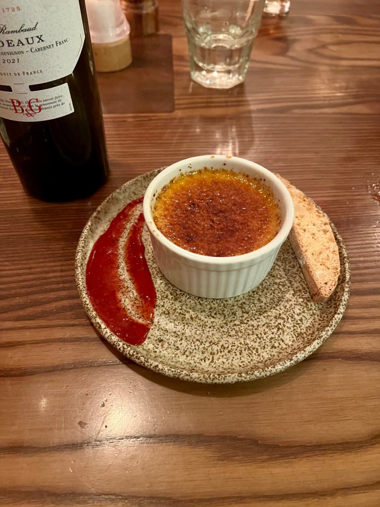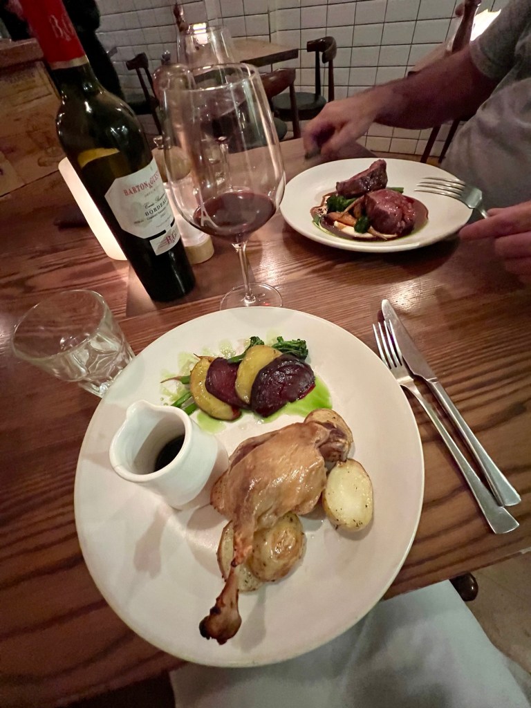 Mick had the beef (perfectly cooked) and I had the duck leg, followed by Crème Brûlée. A bottle of Bordeaux was a perfect accompaniment.