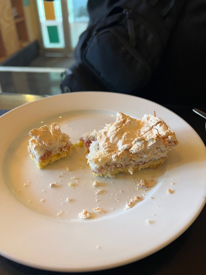 For morning tea, Mick tried a New Zealand speciality – a Louise Cake, with shortbread crust, jam filling and a coconut meringue topping.