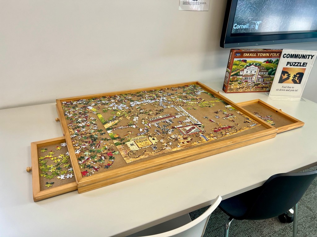 While we waited for our washing and for our bus, we spent some time in the local library, which were almost next door to each other. It was a real find. Nice and warm, free WIFI, comfy seats, a community jigsaw puzzle which I thought Mick would love to do and a group of women with spinning wheels and crochet hooks that kept me mesmerised for awhile.