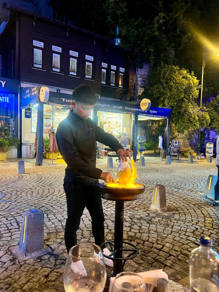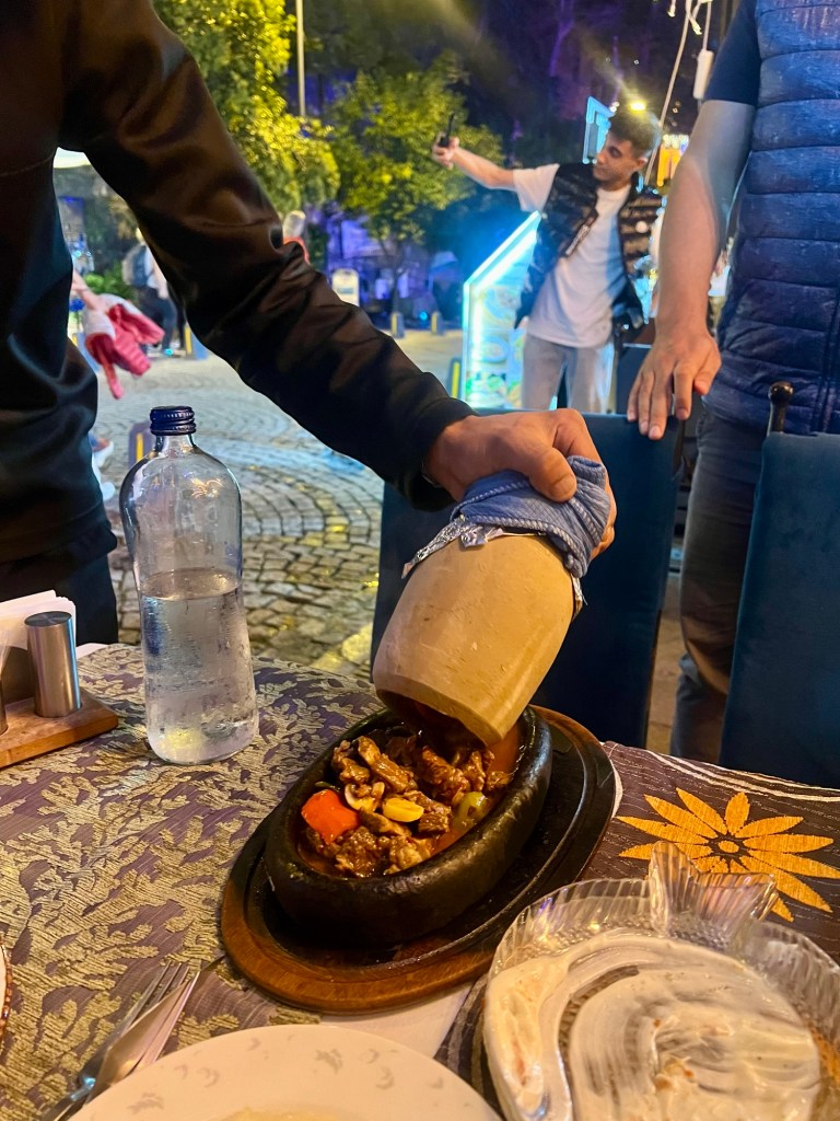 We chose a traditional Ottoman meal, listed as Testi Kebap Cappadocia on the menu, cooked in a ceramic pot and finished on an open fire in front of us, which we shared. We had seen this process at a different restaurant a few nights ago. It is impressive.