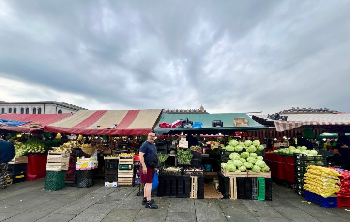 We were almost at the markets – just a few more minutes and we spotted large numbers of umbrellas and stalls with people selling everything from cheese to shoes. But Mick was interested in the price of rabbit and fish.