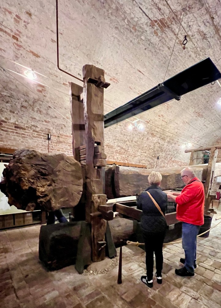 Mick explaining to Jeanie how this massive ancient basket press would have worked.