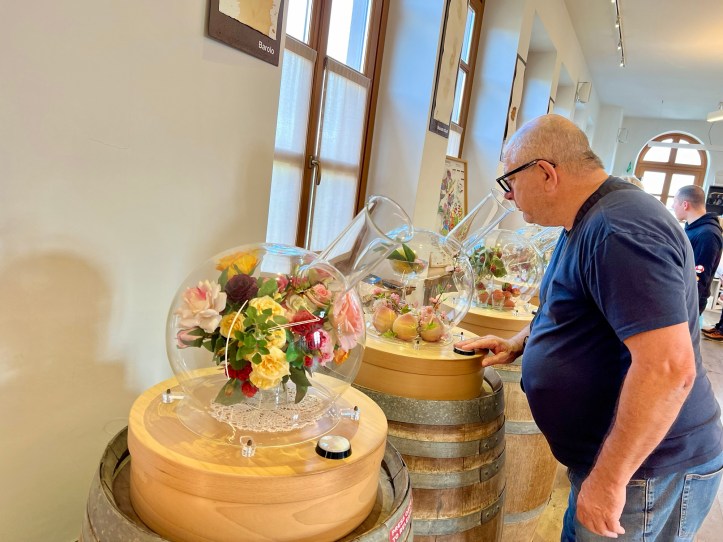Then there was a row of these glass vessels, each filled with something different, like flowers, citrus fruit, strawberries etc. There was a button to press that then released the smell or aroma that they produced, helping visitors to understand the aromas that might be detected in some wines.