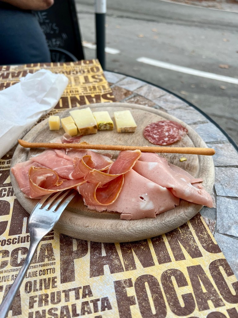 We then returned to our favourite stop – Nonsolovino – the people working here have been so nice to us over the last three days. Mick had decided he wanted to buy a 2016 Barolo to take home to Australia, but before that we had a couple of glasses of wine, plus a cheese and meat platter.