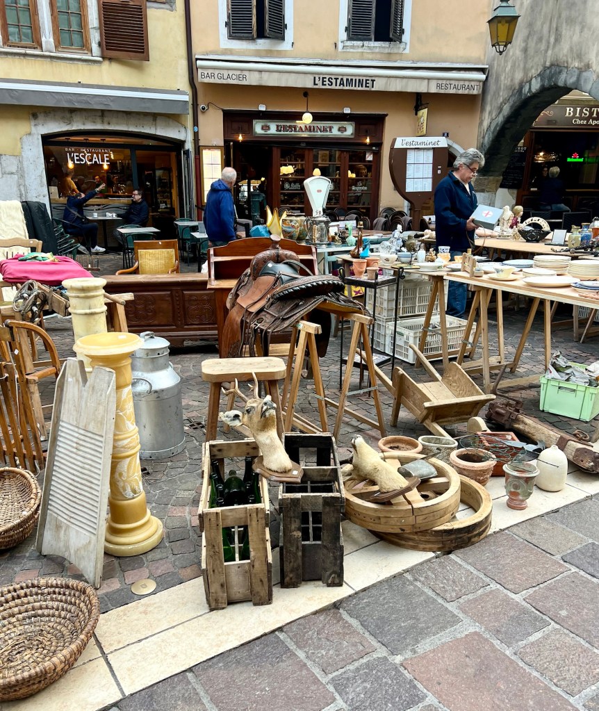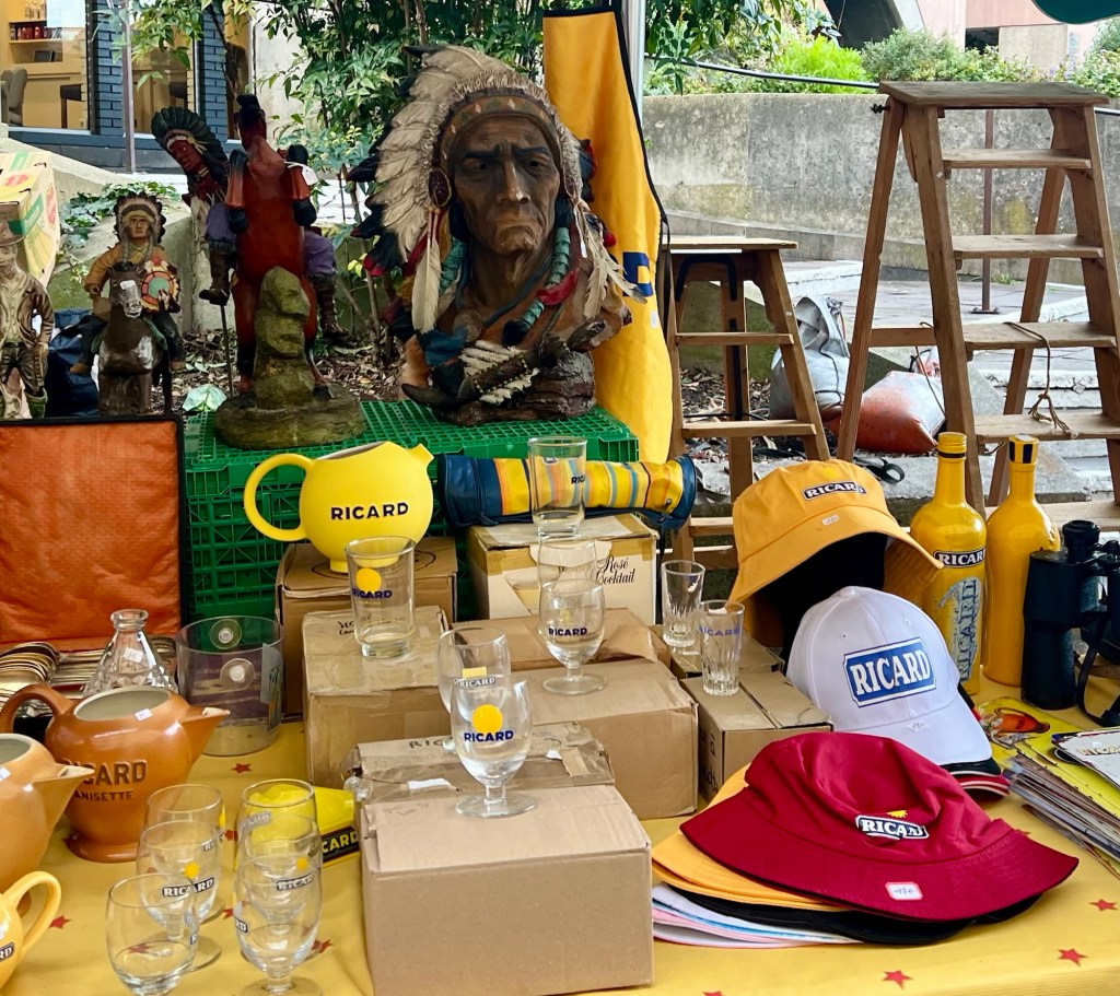 A stroll around our area this morning revealed that today was the day for the brocante (or flea market), and while there weren’t as many stalls as yesterday, there were some interesting things. I tried not to look too hard as I did not want to find anything I couldn’t live without. I was just glad that Mick was not with me as he would have definitely wanted something from the man selling the Ricard paraphernalia.