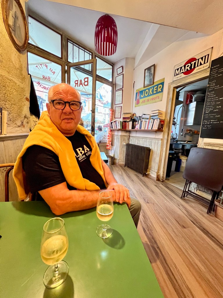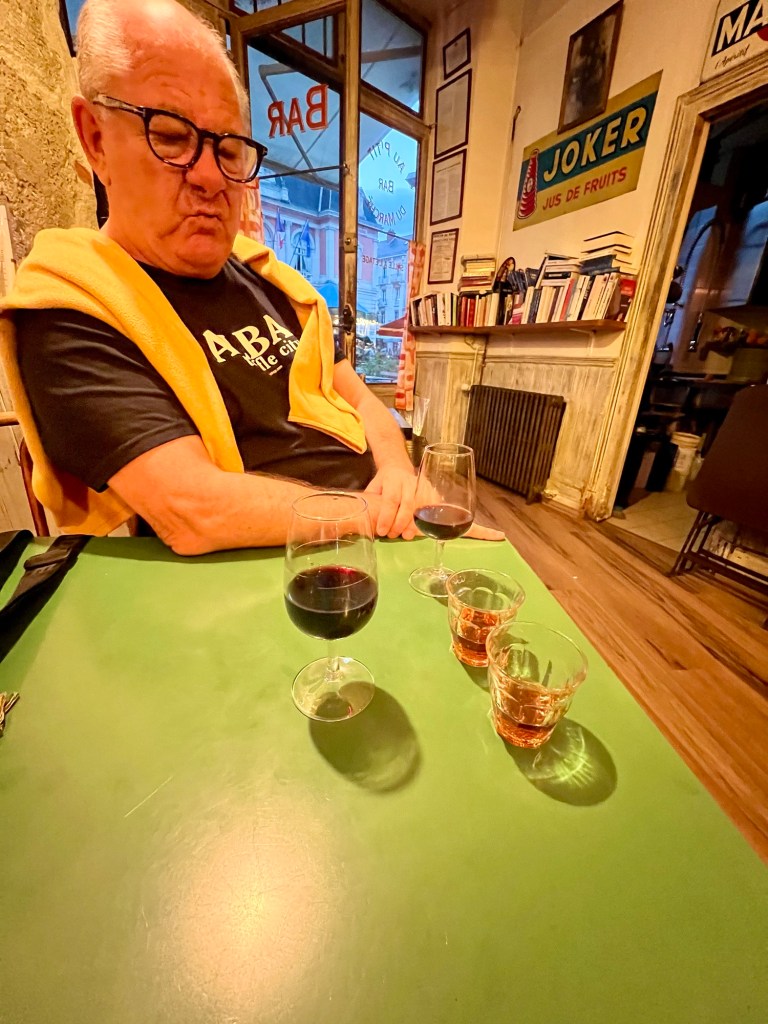 But we needed to try a red !! Mick ordered a Mondeuse from Savoy – but I had had enough and ordered a glass of Minervois – from Longuedoc- Roussillon, an area we know well. Neither was great. We changed establishments and Mick tried a local Gammay but I chose a Crozes Hermitage, as we are heading to that region tomorrow. And now, we are both excited about that as the wine I chose was wonderful. (I have to wait for Mick’s technical notes, mine are a bit simple!)