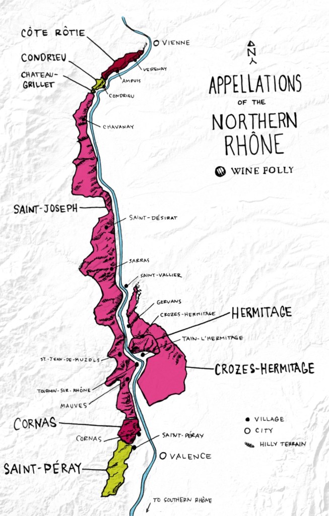 It is really a small wine growing region, and produces only 5% of Rhône wines. Now that surprised me! But what it does produce is thought to be more prestigious, read “more expensive”, than the wines from the Southern Rhône, with the exception of Chateuneuf-du-Pape, of course.