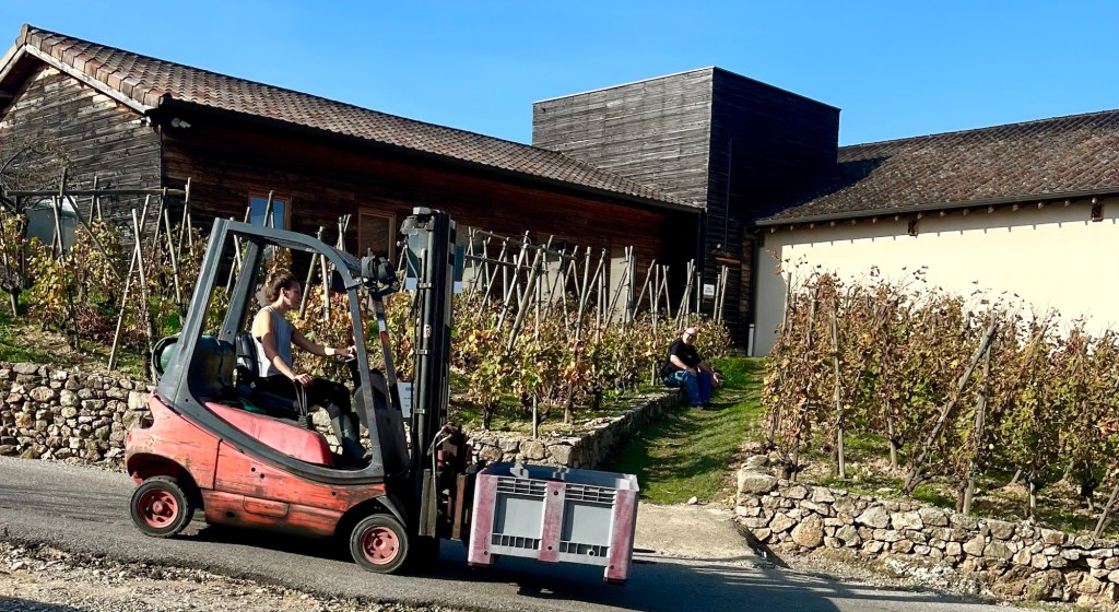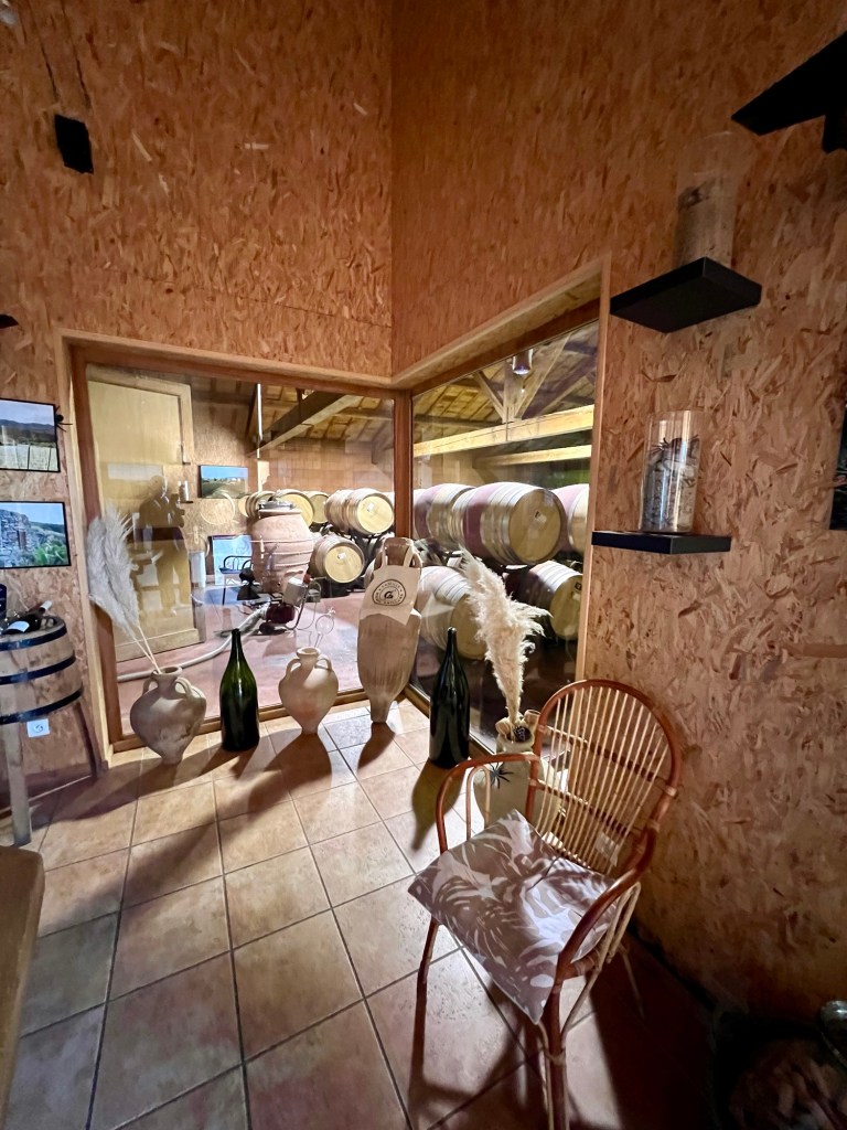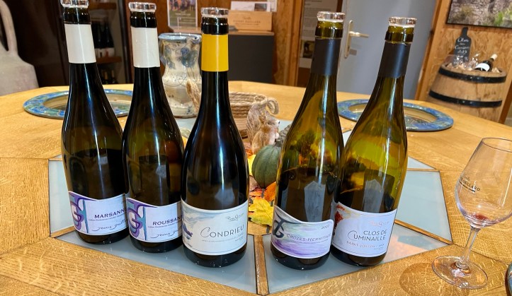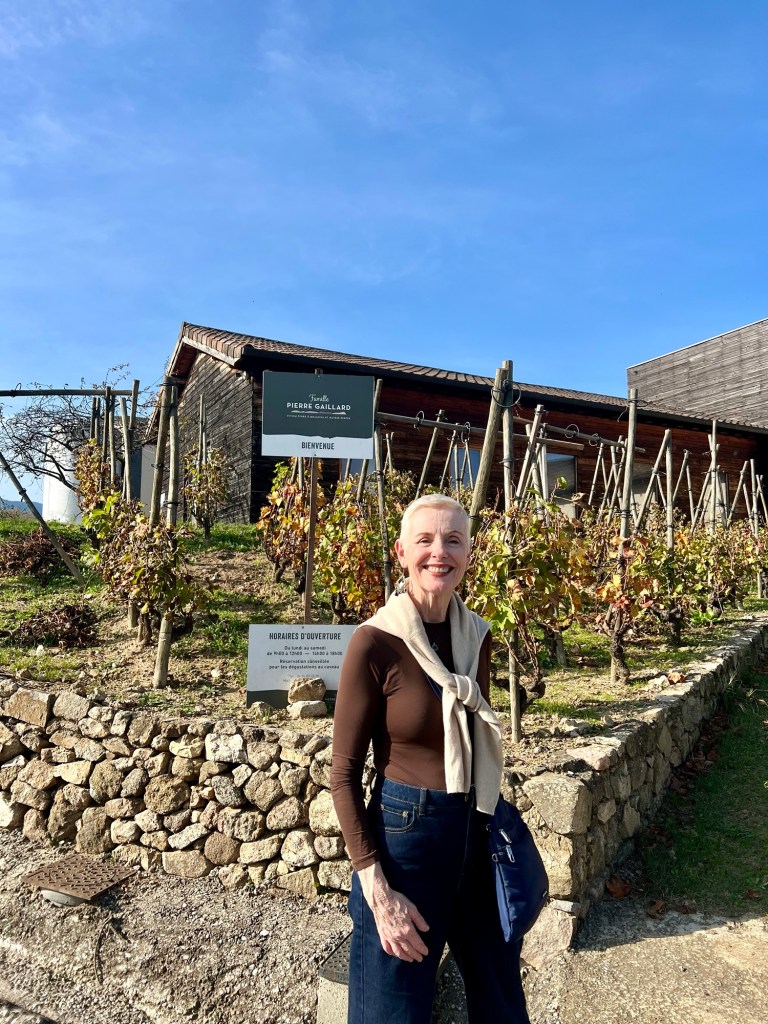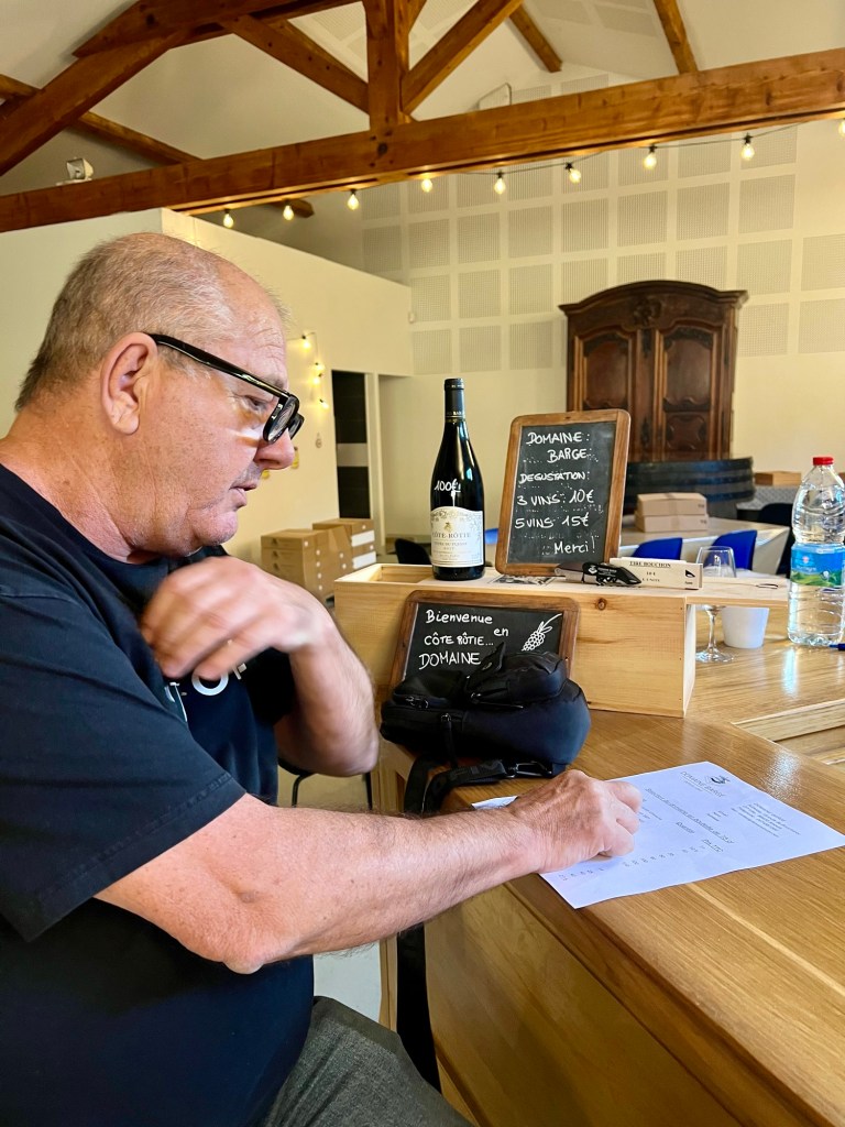 We could have tasted anything here, but limited ourselves to five, including another Condrieu. I even tasted as I could use that cute little sink. This family has vineyards in five different locations, including two in the Longuedoc-Roussillon. The wine here was great and the prices were much more reasonable. We left with two bottles of their wine – a 2023 Marsanne and a Saint Joseph (100% Syrah from grapes grown on the first plot her father had planted), which was her favourite.