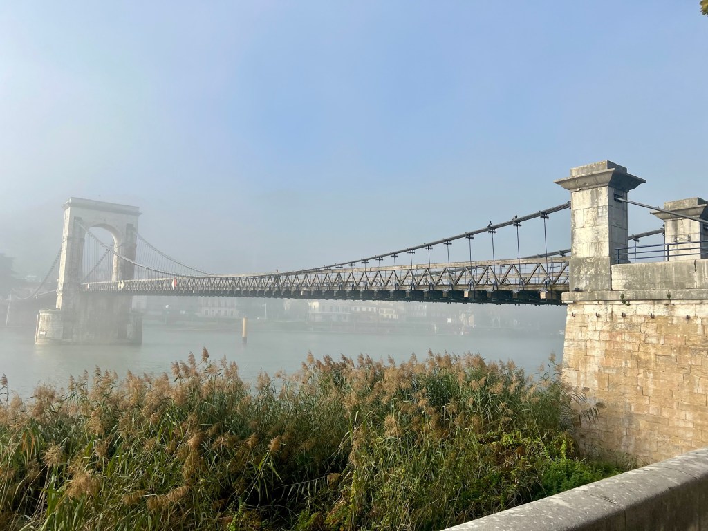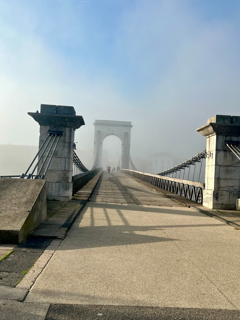 This suspension foot bridge over the Rhône river was completed in 1849 using a technique involving wire cables – Mick was fascinated how the cables had been secured. It is an exact replica of another bridge, dating from 1825, which was once further upstream from here, however it was “demolished in 1965 as it no longer complied with safety and river navigation standards.”