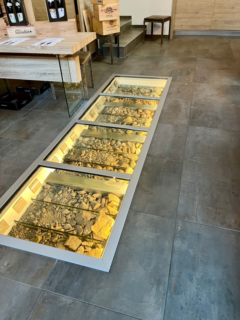 While we were there tasting, the place filled up with some serious buyers – they were wandering around with large trolleys. It is possible to purchase wines very, very cheaply here, including from a “Bag in a Box” or a cask as we call it, as well as purchasing what they called “Exceptional Wines” or museum wines. Mick was tempted by a bottle of 1985 Hermitage for €120, but he decided to think about it.