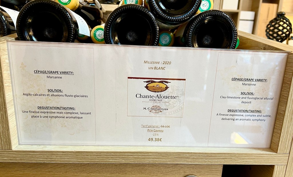 The man who provided the degustation for us was very knowledgeable and patient with us. We were able to try several Marsanne wines from different AOCs, and several Syrah wines. We learnt that the wines from the Cornas AOC were more powerful and that the name translates to “burnt soil’. While it was nice, both of us decided to buy a bottle of the 2017 Hermitage. I was interested to see that in their brochures they use the term AOP (Appellation d’origine Protégée) as opposed to AOC, as the first one is the European equivalent of the latter.