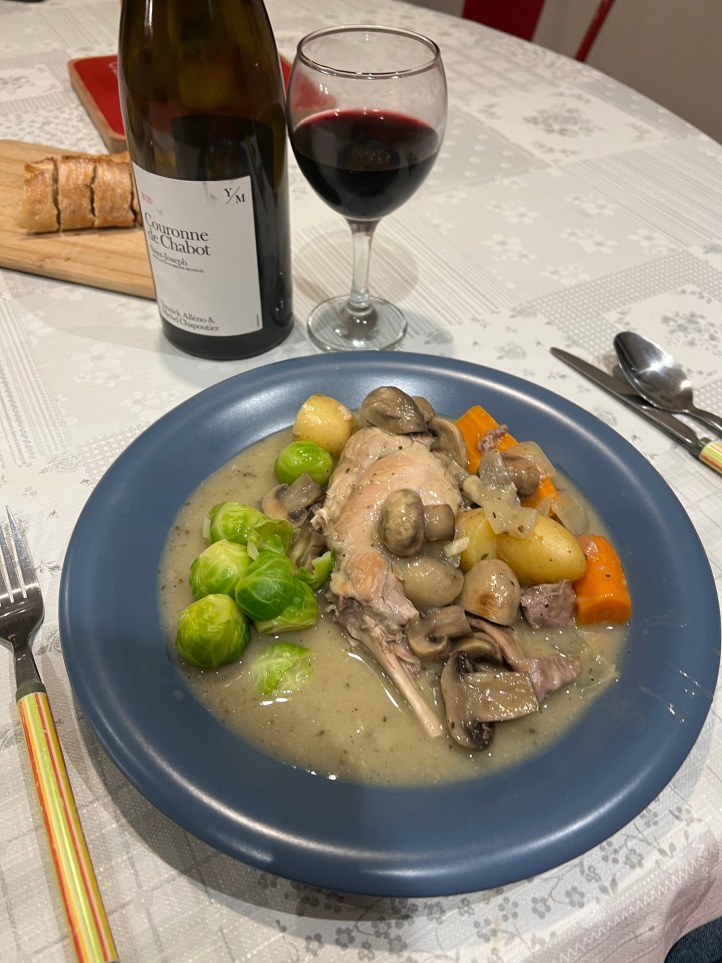 Dinner tonight was another outstanding rabbit casserole, paired initially with a Marsanne (White Hermitage)and then I couldn’t resist the Saint Jospeh Mick purchased at M Chapoutier. It is a bit of a gimmicky wine that was made by Michel Chapoutier and a famous French chef, to go with the meals the chef likes to prepare.