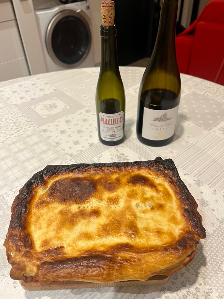 Mick made a pie out of the left over rabbit casserole for dinner and we opened a bottle of Cornas. Amazing.