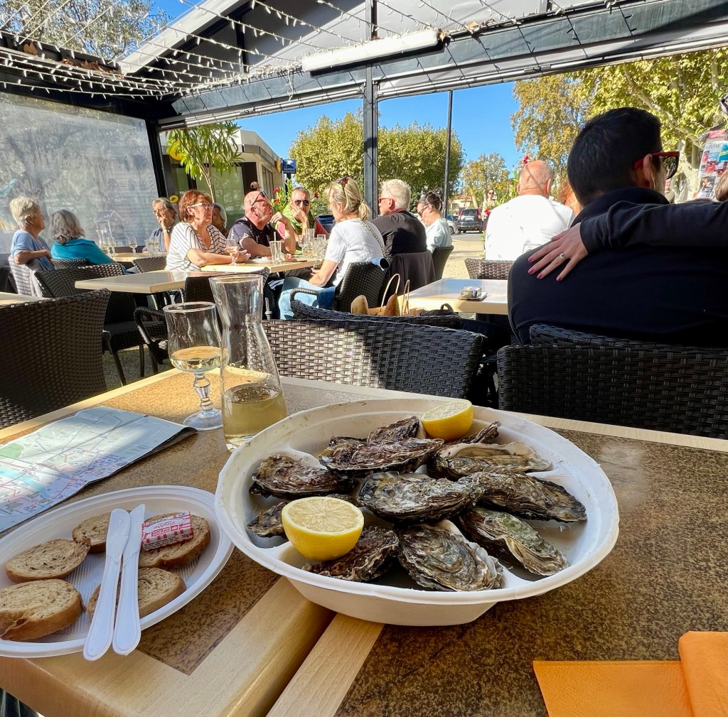 Before we could visit the next site about 300 metres away we needed some lunch. And Mick hit the jackpot. He had spotted a man selling Brittany oysters from a stall inside a sidewalk bar. Once we were seated, the bar owner asked us what we would like to drink and then the oyster man came to take our order. A dozen, cold, large, freshly-shucked oysters with lemon and some bread cost €14.