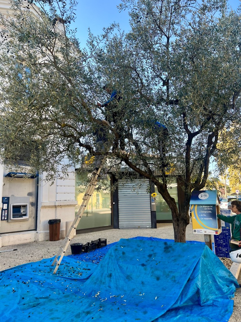 We spotted a man climbing a ladder to harvest olives from what appeared to be a public tree, and later we saw three men in this tree in front of La Poste. They had had a busy and productive day.