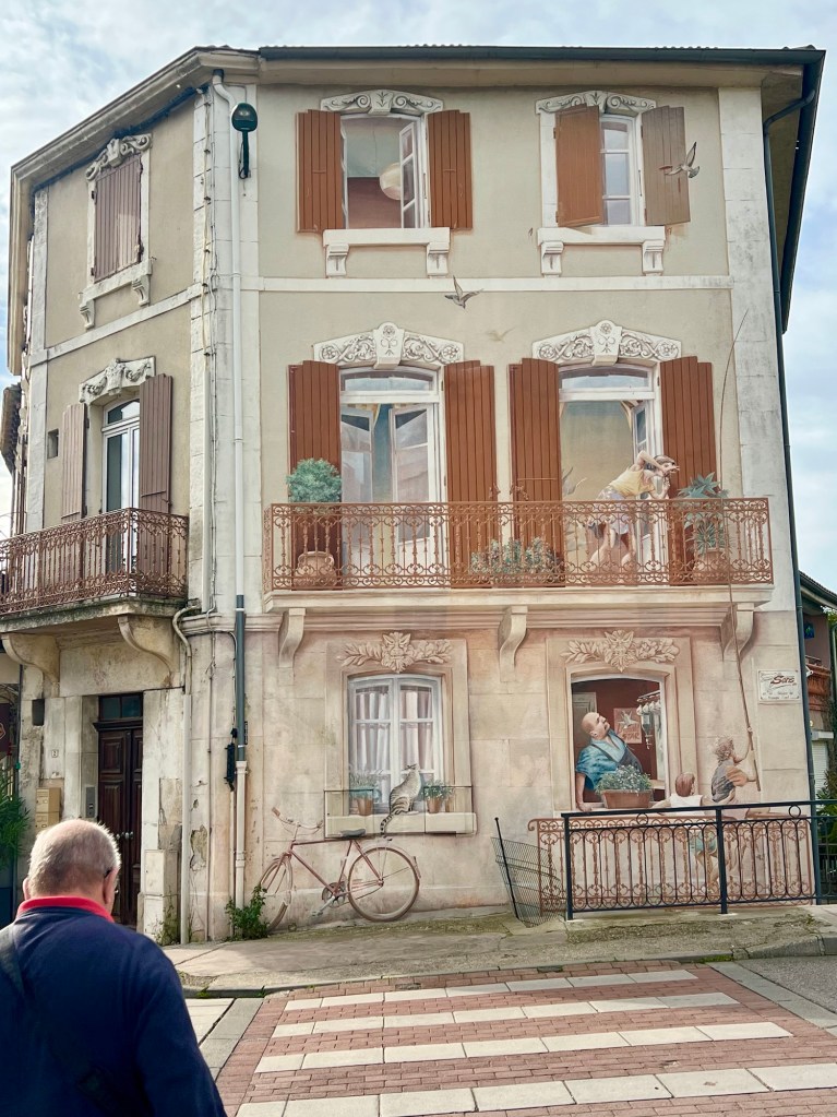 This mural was very clever on one of the buildings we walked past to get us to the café / restaurant / bar. There was nothing to eat (à manger) there but next door at the little supermarket Mick was able to buy a croissant and chocolat pain. Perfect.