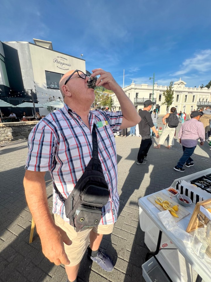 Mick was thrilled to find some fresh oysters for sale from a stall on the edge of the lake. Unfortunately they weren’t Bluff oysters as it is the wrong season, but the woman selling these gets the oysters fresh daily from her father who is the farmer. Tonight he purchased just two for $10NZ, but I am sure we will be back tomorrow for some more – a dozen will cost $50NZ. We found a pub here were we can bring them to eat with a glass of their wine. Perfect.