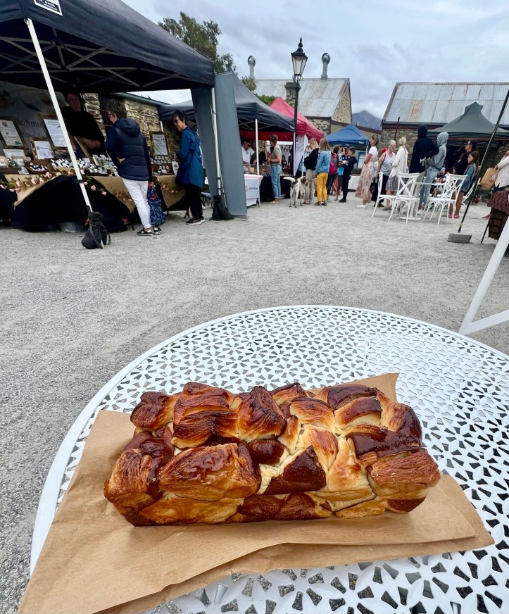 One of the stalls at the market, the most popular based on the number of people lining up, was a small French bakery. Mick wanted a croissant, but when I got to the front of the line I spotted this and had to try it. I asked the French owner if he had a half loaf, as I thought that would be enough, he explained that many people buy it to make French Toast or to use it to make sandwiches as he does. It was soft and fluffy inside made with swirls of plain and chocolate pastry. Quite delicious.