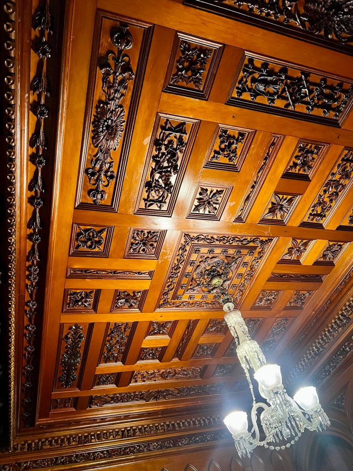 The castle has been restored extensively, but not completely, and I preferred Olveston House to this home. The most impressive features of this house / castle were its ornately carved ceilings. This is just one of them.