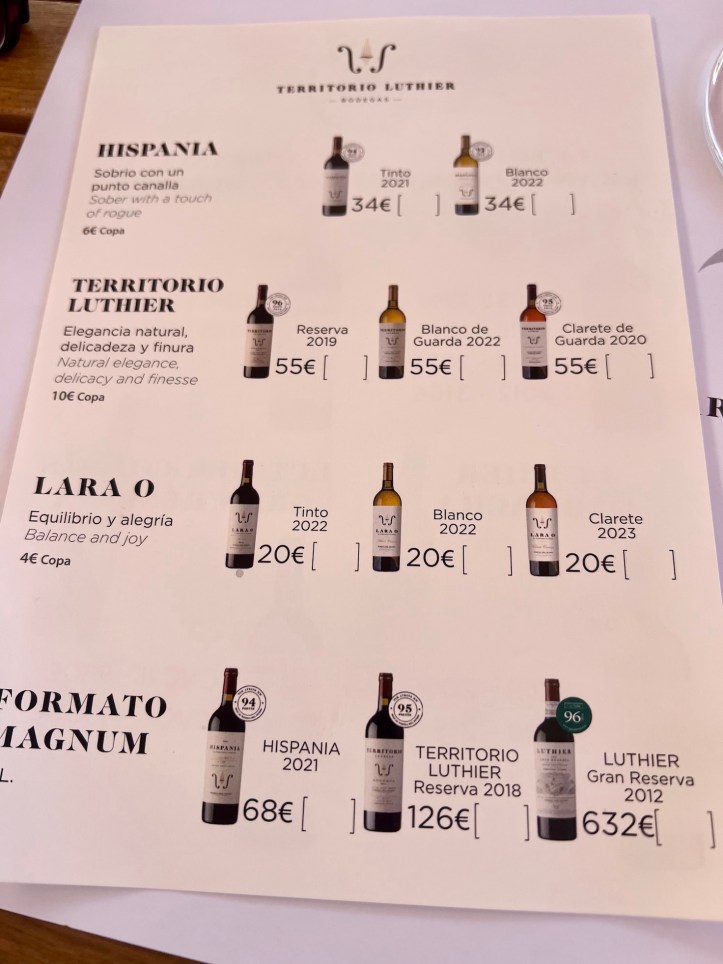 We tried a fabulous white wine – their 2022 Blanco de Guarda, which had undergone malolactic conversion in barrels, and which was made of a ‘field blend’ – all different types of white grapes, but mostly Albillo Mayor. It was fantastic, and apparently it has been voted the best white wine in Ribera. Even though we both loved it, we did not buy a bottle. Instead we bought the 2019 Reserva and a bottle of Clarete. But not any Clarete – pronounced clar-ET-tay. We had not heard of this before yesterday during our tour with Daniel, and here today we tasted two different wines.